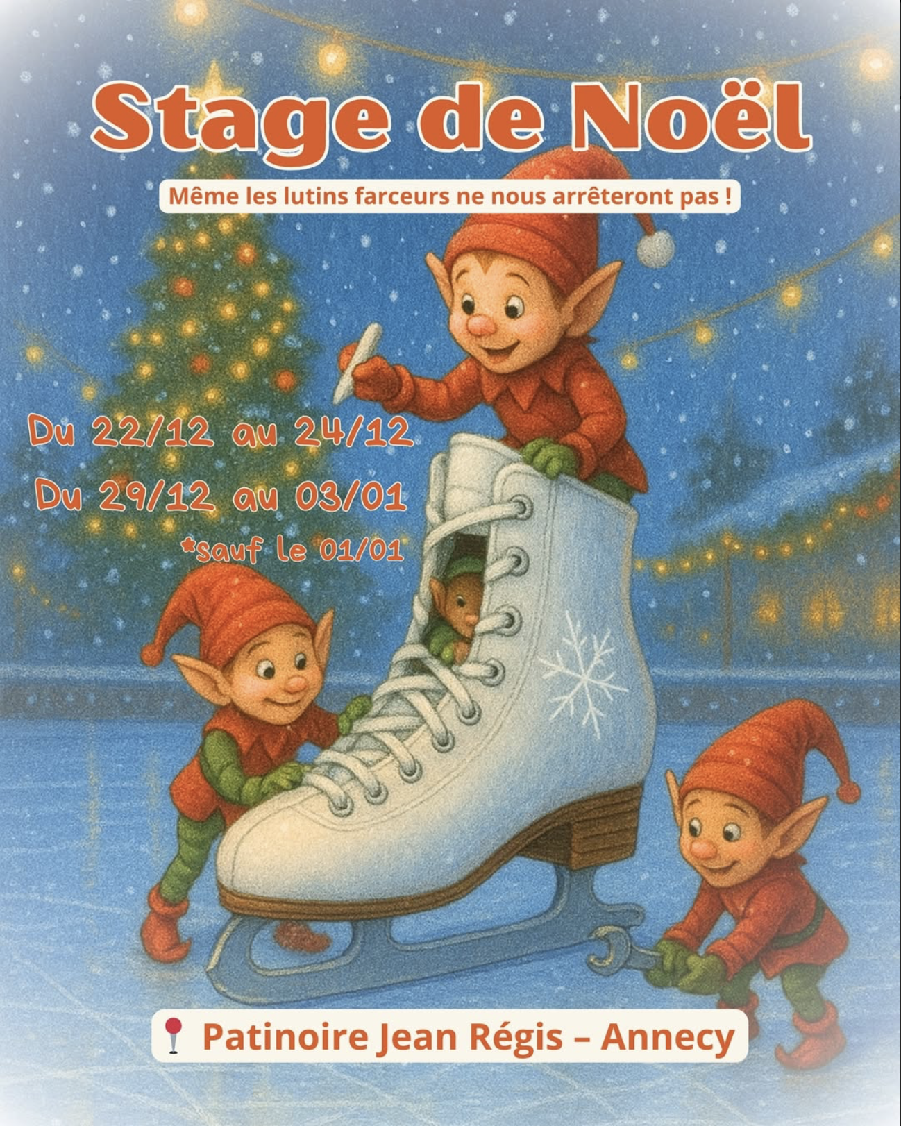 Même si les lutins farceurs s’amusent à faire des blagues sur nos patins… ils ne nous empêcheront pas de nous entraîner pendant les vacances de Noël ! ⛸️🎄 📅 Dates• 22 au 24 décembre• 29, 30, 31 décembre + 2…